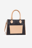 Black And Beige color Tote bag with a fixed strap and gold D-Ring.