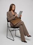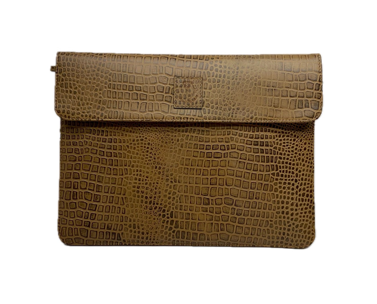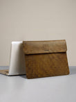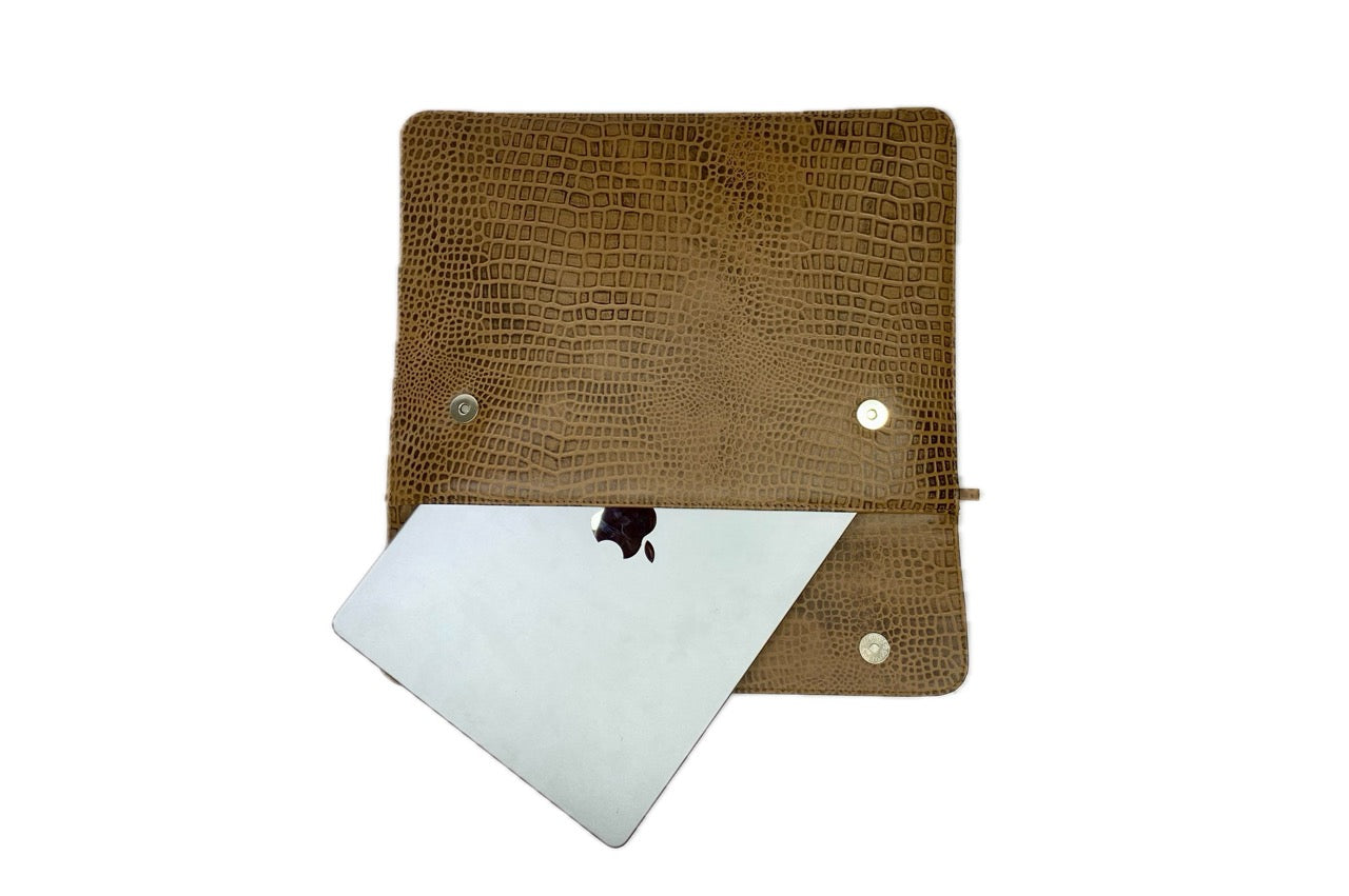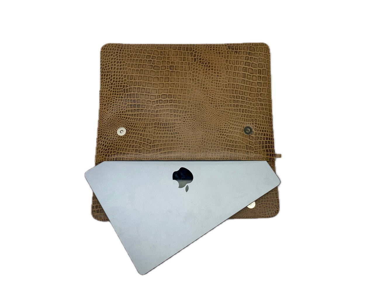 This premium leather laptop sleeve seamlessly blends sophistication with modern style. Crafted from high-quality leather, it features a sleek flap closure for added elegance while securely protecting your device. The minimalist, trendy design shields your MacBook or laptop from everyday wear and tear, while its slim profile makes it perfect for professionals on the go. With timeless appeal and durable construction, this leather sleeve ensures your laptop stays safe in style, whether you're heading to a business meeting or traveling.